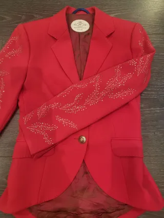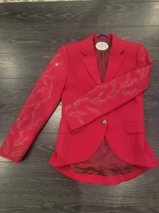 Elegante blazer de The Extreme Collection en color fucsia. - Diseño con pedrería en las mangas. - Cierre de un botón. - Bolsillos frontales con solapa. - Forro interior de satén. Le falta la etiqueta con la talla por eso hay fotos con medidas.
