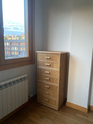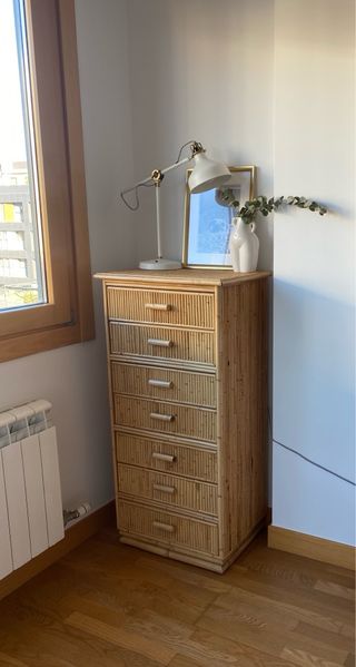 Cajonera de estilo natural con un diseño que combina mimbre y madera. - Seis cajones con tiradores de madera. - Acabado en tonos beige y marrón.
