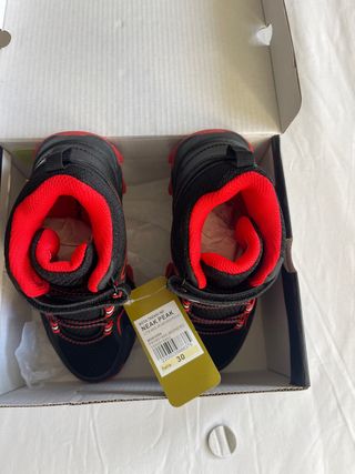 Botas de montaña para niño de la marca Sneak Peak. Perfectas para senderismo y actividades al aire libre. - Color negro y rojo. - Cierre de velcro y cordones. - Suela de goma antideslizante.