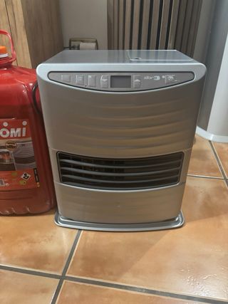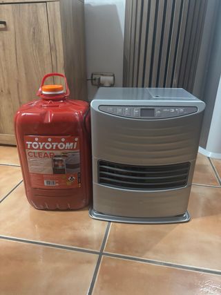 Se vende estufa de parafina junto con su garrafa de combustible. - Estufa de color plateado. - Garrafa de combustible de 20 litros.