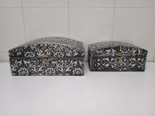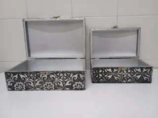 Conjunto de dos cajas joyero con un diseño labrado y acabado plateado. Tapa arqueada. - Diseño floral intrincado. Con cierres metálicos. - Medidas de la caja Grande 26 x 17 x 12 cm. - Medidas de la caja Pequeña 21 x 13 x 10 cm. Tengo caja joyero con 3 cajones a juego. Ver la fotos. Hago precio por las tres. Como nuevas.