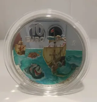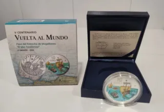 Moneda de plata conmemorativa de España de 10 euros del año 2020. - Conmemora el V Centenario de la Vuelta al Mundo. - Representa el Paso del Estrecho de Magallanes El Mar Tenebroso. - Segunda emisión. - Viene en su estuche original con certificado.