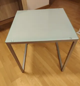 Mesa auxiliar con un diseño moderno y elegante. - Tablero de cristal. - Estructura de metal plateado. - Tiene marcas de uso en el cristal(se ven a trasluz)