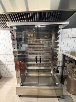 Asador de pollos FECA profesional, modelo de 13 espadas, a gas. Máquina robusta y fiable, con 3,5 años de uso. ✔ Alta capacidad ✔ Buen estado general ✔ Funcionando ✔ Un quemador a revisar (detalle reflejado en el precio) Ideal para hostelería o catering. Se puede ver sin compromiso.