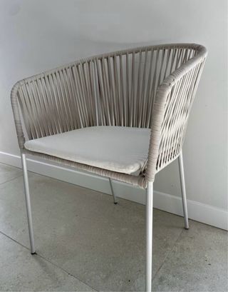 Conjunto de seis sillas de exterior con un diseño moderno y elegante. Perfectas para disfrutar de tu terraza o jardín. - Estructura de metal resistente. - Asiento y respaldo de tela. - Acabado en color beige/gris