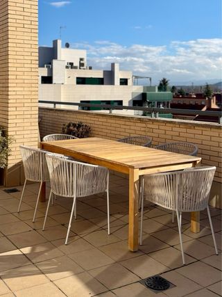 Conjunto de mesa de madera para terraza. - Mesa de madera con estructura de metal. - Sillas con asiento de tela y estructura de metal. 1,80 de largo extensible hasta 220cm Sklum