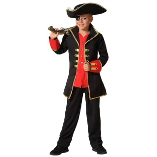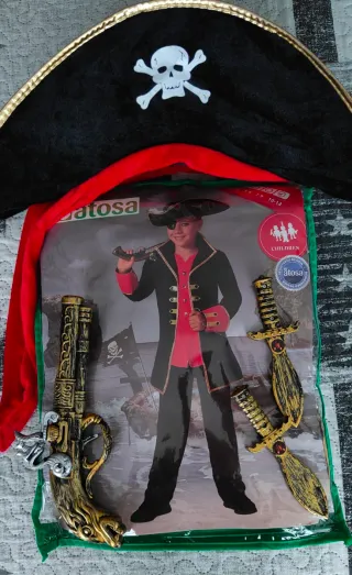 Disfraz de pirata para niño, talla 10-12 - Chaqueta negra con detalles dorados y rojos. - Sombrero de pirata. - Pistola de juguete. - 2 pequeños puñales Tengo también de hombre XL a juego y de mujer talla M. Puedes verlos en mi perfil.