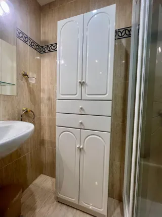 Mueble de baño alto con puertas y cajones. - Diseño moderno y funcional. - Acabado liso y fácil de limpiar.