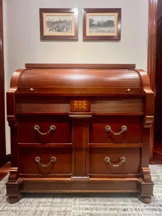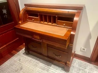 Elegante mueble tipo buró o cómoda con un diseño clásico y funcional. Ideal para añadir un toque de distinción a tu hogar. - Acabado en madera de alta calidad. - Superficie de escritura. - 2 Cajones con tiradores ornamentados. - Compartimentos interiores para organización.