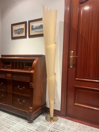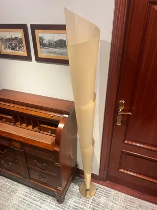 Elegante lámpara de pie con un diseño moderno y llamativo. Su estructura combina tonos beige y dorados, aportando un toque sofisticado a cualquier espacio. - Materiales de alta calidad. - Diseño escultural único.