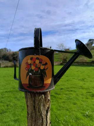 Regadera de metal con un bonito diseño pintado a mano de un jarrón con tulipanes. - Material: Metal. - Diseño: Flores pintadas.
