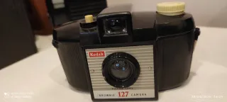 Cámara fotográfica antigua Kodak Brownie 127 fabricada en baquelita. Un modelo clásico para coleccionistas. - Cuerpo principal en color negro. - Detalles en color beige.