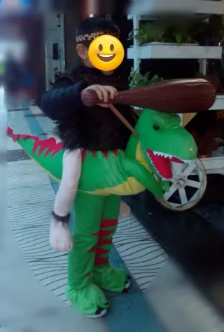 Disfraz de niño/niña que simula ir montado en un dinosaurio T-Rex. Talla única, el niño de la foto tenía 6 años en ese momento. - Diseño de dinosaurio verde con detalles rojos. No es hinchable es como de peluche con relleno.