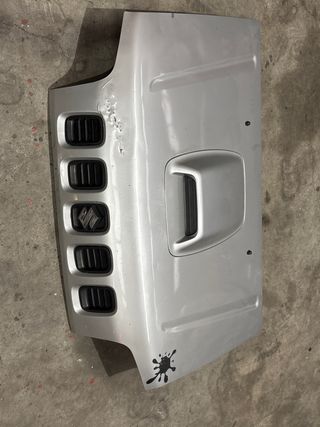 Capó de Suzuki Jimny en color plata. Presenta un diseño con rejillas y una toma de aire central. **para reparar - Rejillas frontales. - Toma de aire en relieve. - Logo de Suzuki. - Adhesivo decorativo tipo salpicadura.