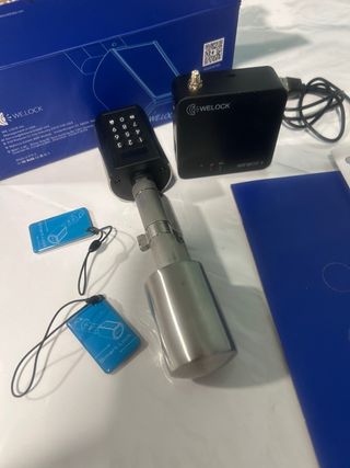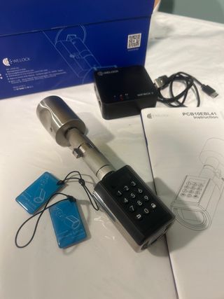 Cerradura electrónica inteligente WELOCK PCB10EBL41, con teclado numérico y acabado metálico. - Incluye Wi-Fi Box 3. - Dos llaveros Smart Lock de color azul. - Manual de instrucciones.