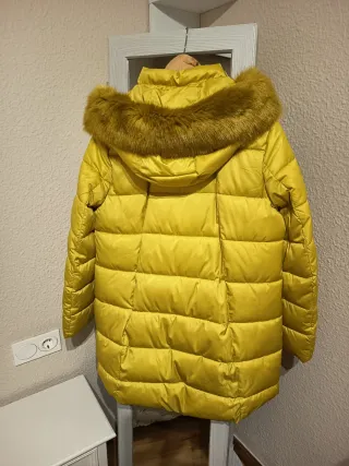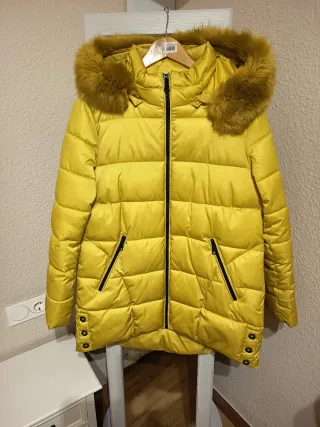 Parka acolchada de color amarillo brillante, con capucha desmontable adornada con pelo sintético. - Cierre frontal de cremallera. - Bolsillos laterales con cremallera. - Puños con detalle de botones. - Diseño acolchado.