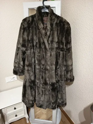 Abrigo de pelo sintético en tono marrón. Su diseño es elegante y cálido. - Material: Pelo sintético. - Color: Marrón.
