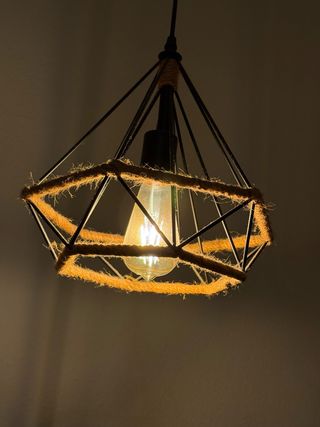 Lámpara colgante con un diseño industrial y moderno, ideal para dar un toque único a tu hogar. - Estructura geométrica hexagonal de 15 cm de lado. Diámetro 30 cm. - Acabado en negro y detalles de cuerda. - Bombilla de filamento visible.