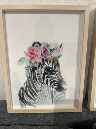 Set de 4 láminas decorativas de animales bebés con coronas de flores, enmarcadas con marcos Hovsta. - Ilustraciones de cebra, elefante, león y jirafa. - Marcos de madera clara. MARCOS MEDIDA 30x40cm PRECIO POR UNIDAD 15€