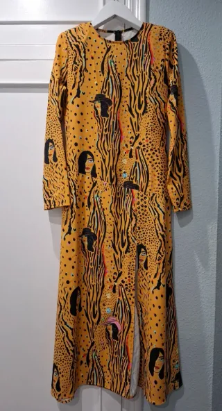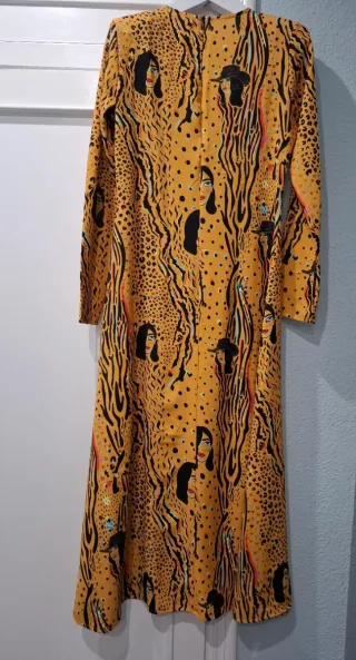 Vestido con un llamativo estampado y un aire retro. - Diseño de manga larga. - Abertura lateral. - Estampado multicolor con fondo amarillo. Lo he usado en una ocasión pero lleve un bolso con tachuelas metálico y si te fijas muy de cerca hay un hilo que rozó