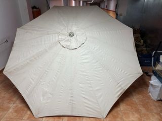 Mesa de camping CRESPO, ideal para exteriores. Su diseño plegable facilita su transporte y almacenamiento. - Superficie dividida en dos secciones. - Patas metálicas ajustables. - Abertura central para sombrilla.