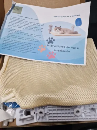 Hamaca para gato diseñada para colocar en la ventana, ofreciendo un lugar cómodo para tu mascota. - Incluye instrucciones de uso e instalación. - Material de malla transpirable.
