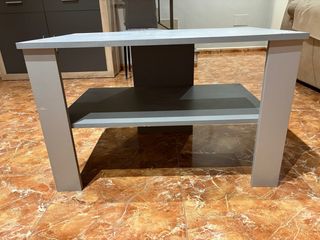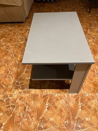 Mesa de centro moderna en color gris, con un diseño funcional. - Estructura de madera. - Dos niveles de superficie. - Patas robustas.