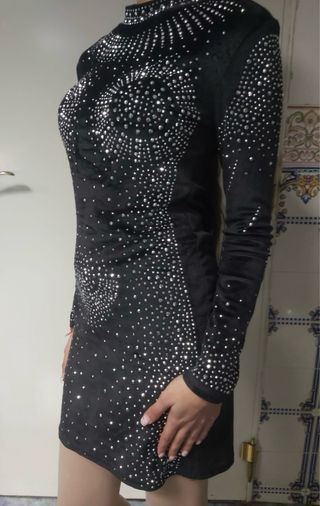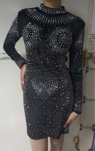 Elegante vestido de manga larga con un diseño lleno de brillos plateados. - Cuello alto. - Manga larga. - Adornado con pedrería plateada.