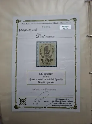 1938. II Aniversario del Alzamiento Nacional. DICTAMEN de AUTENTICIDAD del 854. Sello muy falsificado