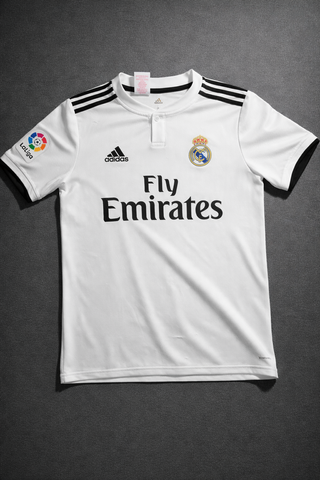 Camiseta de fútbol del Real Madrid. - Diseño clásico en blanco con detalles negros. - Logo de Adidas y escudo del club. - Inscripción Fly Emirates en el frontal.