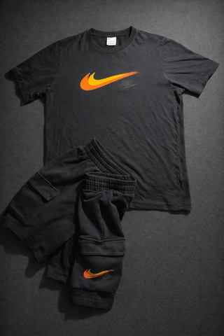 Conjunto deportivo de camiseta y pantalón corto de la marca Nike. El diseño presenta un llamativo logo en tonos naranjas y amarillos. - Camiseta de manga corta. - Pantalón corto con bolsillos cargo.