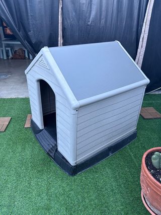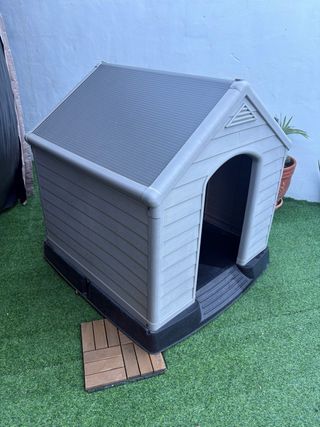 Casita para perros fabricada en resina, ideal para exteriores. Su diseño robusto ofrece un refugio seguro y cómodo. - Material: Resina resistente. - Color: Gris y base negra. - Diseño de fácil montaje.