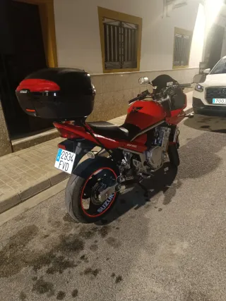 Moto Suzuki GSF 650 Bandit en color rojo. - Baúl trasero SHAD. - Neumático trasero con banda roja. - Matrícula visible: 2934 FVD.