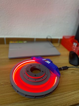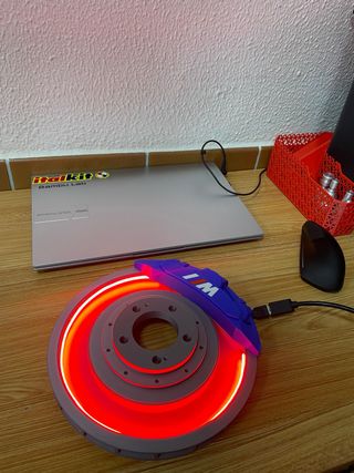 Original lámpara decorativa con forma de disco de freno y pinza BMW. La iluminación LED en color rojo le da un toque llamativo. - Diseño inspirado en discos de freno de coche. - Pinza de freno con logo personalizado - Iluminación LED roja.