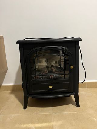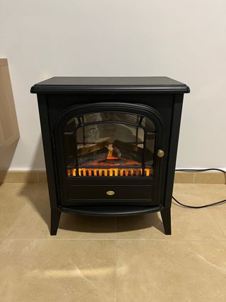 Estufa eléctrica de estilo clásico. - Acabado en color negro. - Puerta frontal con detalles ornamentales. - Base con patas estables.