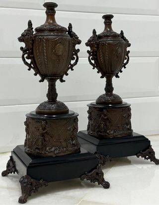 Antigua y espectacular pareja de copas/cassolettes de origen francés de mediados del siglo XIX y estilo Napoleón III realizadas en metal zinc técnico sobre base de mármol negro de Carrara alzadas sobre 4 patas en bronce macizo. Decorada con escenas de la época y asas con formas de cara de león y todo original de época. Unas piezas de colección elegantes y únicas que decorarán cualquier rincón dando distinción. Véanse las fotografías para hacerse una mejor idea de los detalles que forman parte de la descripción. Medidas: 43 cms de alto, 21 cms de ancho y 20 cms de fondo. ENVIAMOS CON TRANSPORTE Y EMBALAJE PROFESIONAL.