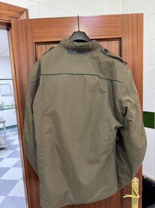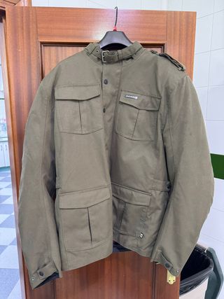 Chaqueta de moto Bering Norris Evo en talla 3XL. Diseño funcional y resistente. Espaldera instalada como extra. - Color verde militar. - Cierre con cremallera y solapa. - Múltiples bolsillos frontales. - Cuello ajustable con hebilla.