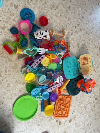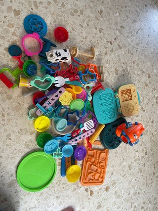 Set de juegos de plastilina con muchos accesorios para crear figuras. - Incluye moldes de animales, formas y utensilios de cocina. - Varios colores de plastilina. - Bandeja para cortar y moldear. - Incluye un avión de juguete.