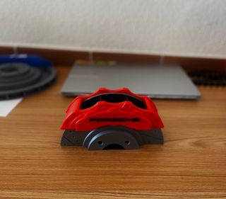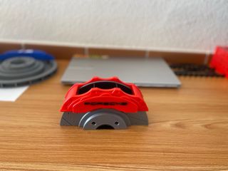 Original portalápices con diseño inspirado en un freno de disco Porsche. - Color rojo y gris. - Detalle del logo PORSCHE en negro.