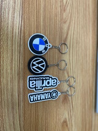 Conjunto de llaveros con diseños de marcas automovilísticas y de motocicletas. - Llavero con logo de BMW. - Llavero con logo de Volkswagen. - Llavero de Aprilia Racing. - Llavero de Yamaha.