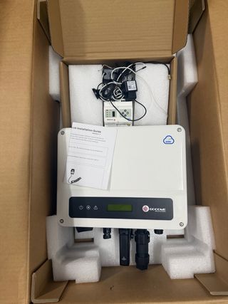 Inversor monofásico de autoconsumo de la marca GoodWe, modelo de 2.5 KW. - Diseño compacto y ligero. - Pantalla LCD integrada. - Conexiones para panel solar y red eléctrica. Meter incluido