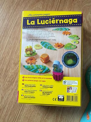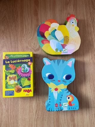 Lote de juego de mesa y dos puzles infantiles. - Juego La Luciérnaga de HABA, recomendado para mayores de 2 años. - Puzle con forma de gato de Djeco, recomendado para mayores de 3 años. - Puzle con forma de gallina de Djeco, recomendado para mayores de 3 años.