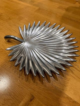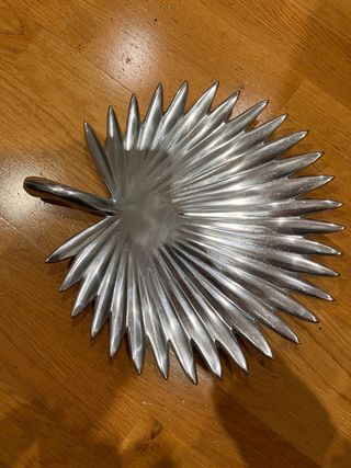 Elegante bandeja decorativa con forma de hoja. - Material: Metal - Diseño: Hoja de palmera - Acabado: Brillante Puede tener varios usos. En la foto se ve una mano para apreciar el tamaño