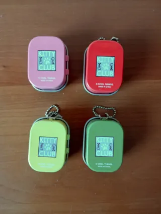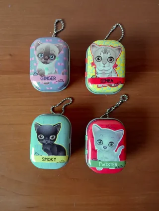 Conjunto de cuatro pequeñas cajitas metálicas con diferentes gatos. Incluyen un llavero para poder colgarlas. Cool things