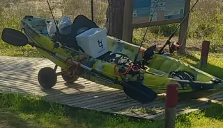 Diseño amarillo y negro. Equipación del Kayak de pesca Barracuda Pro: • Asiento acolchado con mochila trasera • Hueco para sonda en casco con tapadera de protección • Soporte para motor en molde • Línea de vida en costado • 4 cañeros fijos con sus tapones (2 delante y 2 detrás) • 1 cañero giratorio multifuncional regulable • 1 tambucho grande de casi 30cm estanco con vivero junto al asiento • 1 tambucho grande de casi 30cm estanco grande en proa con cesta interior • 1 soporte de estrella en bañera trasera para camara, banderola, etc... LA SONDA Y EL CARRO NO SE VENDEN!, viene con todo lo de la descripcion. REGALO CHALECO salvavida