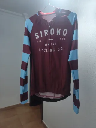 Maillot de ciclismo de manga larga con diseño de rayas en mangas. - Color principal burdeos. - Rayas en color azul claro en las mangas. - Logo de Siroko en el pecho. - Tela perforada - Talla L - PVP 55 € - Leve picotazos maga derecha, ver fotos