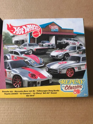 Dos sets de Hot Wheels de la colección Replay the Classics 80s. - Set 1: 80 aniversary 8 coches - Set 2: Replay the Classics con 7 coches clásicos. - Incluye modelos como '82 Toyota Supra, Dodge Viper RT/10, Porsche 935, y más.