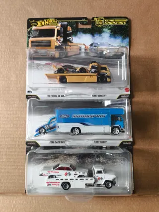 Lote de tres vehículos Hot Wheels Car Culture Team Transport.# 86 #87 #88 - Incluye '20 Toyota GR Supra con Fleet Street. - Incluye Ford Capri GR5 con Fleet Flyer. - Incluye un camión de transporte con un coche clásico.