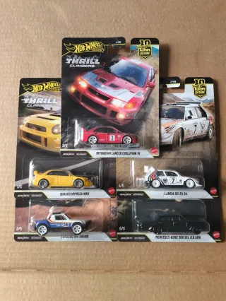 Colección de 5 coches Hot Wheels Premium Car Culture. - Mitsubishi Lancer Evolution VI - Subaru Impreza WRX - Porsche 914 Safari - Lancia Delta S4 - Mercedes-Benz 300 SEL 6.8 AMG