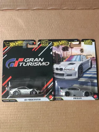 Dos modelos de Hot Wheels Premium. - Hot Wheels Pop Culture Gran Turismo 2022 Porsche 911 GT3 RS. - Hot Wheels Boulevard BMW M3 GTR.